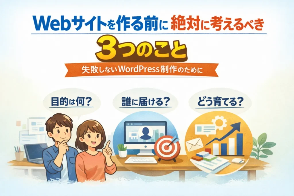この記事では、Webサイト制作でよくある失敗を避けるために、制作前に必ず考えておきたい3つのポイントを、できるだけ分かりやすく解説します。
